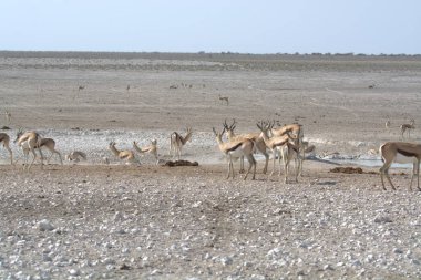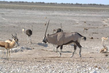 Etosha 'da bir su birikintisinde çeşitli hayvanlar