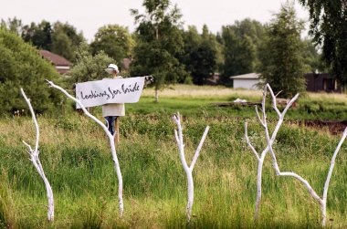 Vers-Sur-Mer, Fransa - 05 16 2025: British Normandy Memorial. The Standing with Giants 'ın panoramik görüntüsü. İki hemşire silueti var.