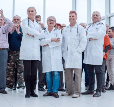 Hasta belgelerini inceleyip tedavi planlarını tartışırken beyaz üniformalı bir grup sağlık görevlisi hastane koridorunda yürüyorlar.