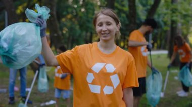 Parkta geri dönüşüm torbaları olan çocuklar üzerindeki yeşil geri dönüşüm işaretlerinin canlandırılması. ekoloji, yeşil yaşam ve sürdürülebilirlik kavramı dijital olarak oluşturulmuş video.