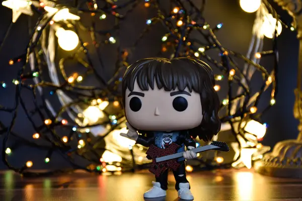 "Stranger Things" dizisindeki Eddie Munson 'ın aksiyon figürü. Sıcak ve renkli çelenk ışıkları, turuncu ışık, siyah arkaplan, kasvetli yer.