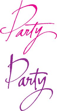 Parti sözcüğü. İtalyanca yazı tipi. Mor renk ve şeftali rengi alt tabaka. Farklı tonlar. Beyaz bir arka planda izole edilmiş. İşaretli bir yazı. Farklı renklerin üstüste konması.
