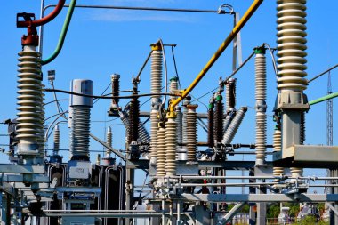 Yüksek voltaj düğmesi. Yüksek voltajlı elektrik trafo istasyonu. Elektrik santrali. Güç hattı.