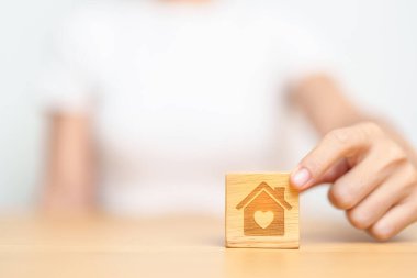 Ev güvenliği. Ahşap masadaki ev figürlerini arka plandaki ışığa karşı koruyan kadın, yakın plan.