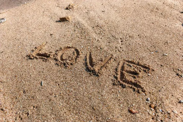 "Kumun dokusuna odaklanmış güneşli bir kumsalda kumlara yazılmış aşk..