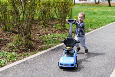 On beş aylık bir bebek evin yanındaki çimenlikte üç tekerlekli bisiklete biner..