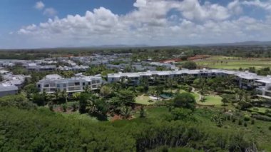 Benzersiz bir volkanik manzaradaki yemyeşil palmiye ağaçları arasında çarpıcı bir tropikal tatil köyünün panoramik manzarasının tadını çıkarın.