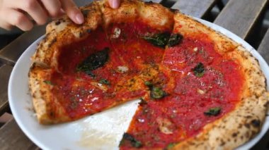 Bir insan bir dilim biberli pizzadan zevk alır, neşe veren yiyeceklerin sergilenmesi büyüleyici bir atmosfer sağlar.