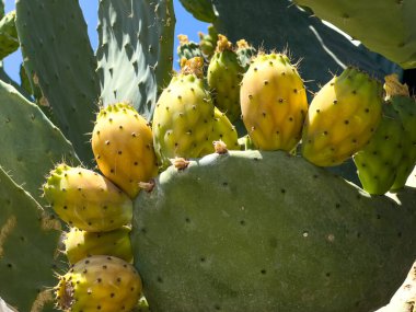 Detaylı olarak dikenli armut kaktüsü meyvelerinin yakın çekimi. Doğal büyüme, tarım ve açık havada yenilebilir egzotik bitkiler..