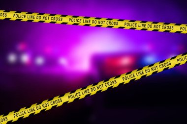 "Polis Sınırı Geçilmez" yazan Sarı Kayda Odaklı Yakın Çekim. Suç Mahalli 'nin Yasak Bölgesi. Flickering Siren Işıkları ile Bokeh Arkaplanı. Adli tıp ekibi bir dava üzerinde çalışıyor.