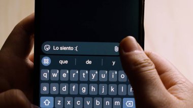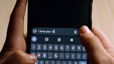 "Teşekkürler!" yazarken akıllı telefonu tutan ellerin yakın çekimi. bir mesajlaşma uygulamasında.