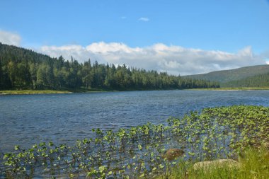 Kanada, 28 Temmuz 2025: Durgun orman gölü yemyeşil ağaçlarla çevrili gökyüzünü yansıtıyor