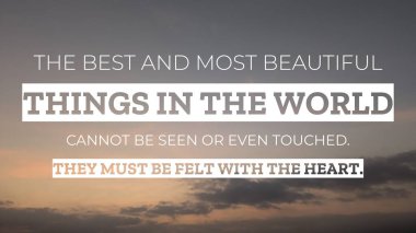 Dramatik bir alıntı, 'Dünyadaki en iyi ve en güzel şeyler görülemez ya da dokunulamaz - Kalp ile hissedilir,' bulanık, dokulu, gri ve beyaz arka planda sergilenir.