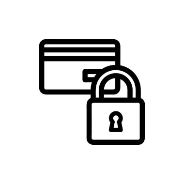 Kapalı bir asma kilidin yanında finansal güvenlik ve korumayı simgeleyen bir kredi kartı tasvir eden basit bir çizgi sanat simgesi.