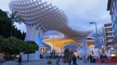 Encarnacion Meydanı 'ndaki Metropol Şemsiyesi hiperlapası, panoramik yürüyüş yolu ve arkeoloji müzesi olan fütürist bir ahşap yapı. Mavi gökyüzü, ağaçlar ve şehir manzarası Sevilla, İspanya.