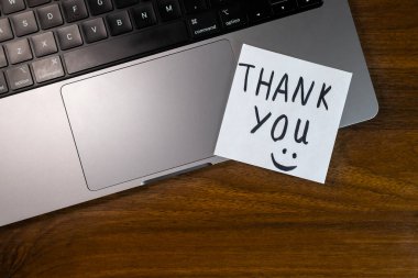 Elle yazılmış sarı yapışkan not. Açık bir dizüstü bilgisayara yerleştirilmiş. Etrafı renkli ciltler, kalemler ve ahşap bir masadaki diğer ofis malzemeleriyle çevrili. Minnettarlık ve ofis kavramları için mükemmel..