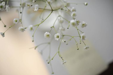 Tahta arka planda beyaz çiçekler, düğün töreni için güzel bir dekor.