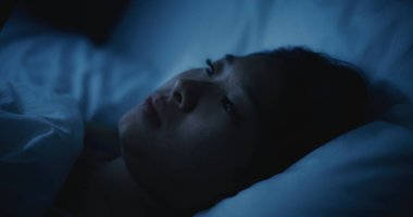 Genç Asyalı Kadın Gece Uyanık Kaldı, Uyuyamadı. Kız rahatsız edici bir şekilde vardiya alıyor, Stres ve Endişeli Düşünceler tarafından bunaltılıyor. Uykusuzluk, Huzursuz Düşler, Zihinsel Gerilim, Yoksul Dinlenme.