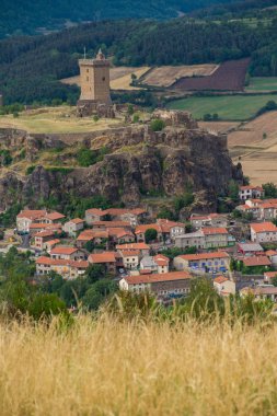 Palencia vilayetindeki Duenas 'ın panoramik manzarası, köyün kırmızı çatılı evleri ve Santa Maria de la Asuncion Kilisesi' nin dramatik, bulutlu gökyüzüne karşı ayakta duran kulesiyle birlikte yemyeşil bir tepeden gözler önüne seriliyor..