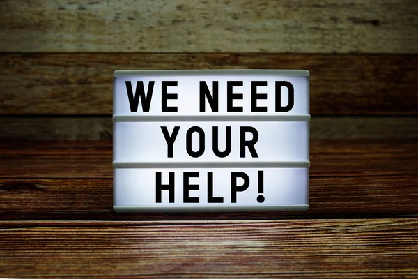 "Yardımınıza ihtiyacımız var!" yazılı bir ışık kutusu. ahşap arkaplanda