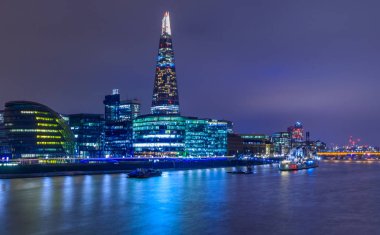 Londra, Birleşik Krallık - 14 Mayıs 2018: Londra 'nın gökdelenli gece manzarası ve Thames Nehri' ne yansıyan HMS Belfast.
