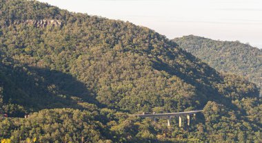 Yeşil dağ manzarası. Dik bir dağ yamacında, sık yeşil bir ormandan geçen kablo araba..