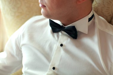 Damadın erkekler damat onun papyon ile yardım
