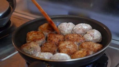 Canlı canlı kızarmış köfte. Tavada Köfte Pişiriyorum. Kızarmış Köfteler ve Browning 'e bile ulaşan köfteler. Köfte pişirmek için kullanılan cızırtılı tava metodu Mükemmel Altın Renge
