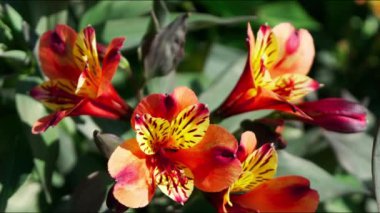 Canlı Peru zambağı çiçeğinin kendine özgü çizgileri ve sabah çiğ taneleri olan 4K videosu. Bu zarif çiçek demeti dramatik bir kahverengi arkaplan karşısında izole edilmiş parlak sarı ve turuncu yapraklara sahiptir.