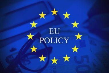 Avrupa Birliği bayrağının banknotlarla örtüldüğü, AB yönetmeliklerini gösteren kavramsal bir imaj. Avrupa mali kuralları, uyumluluk, yönetim ve ekonomik yönetimi temsil eder.