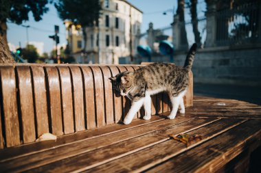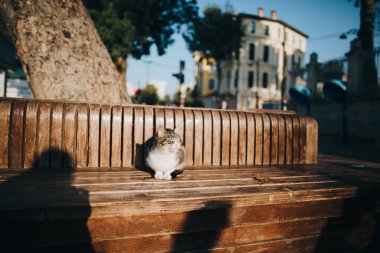 Bahçedeki ya da parktaki ahşap bir bankta rahatça uzanan siyah kedi. Doğal hayvan davranışları, açık hava rahatlığı ve rahat yaşam tarzı kavramını yakalar..
