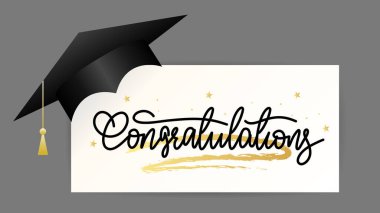 Tebrik metni ve mezuniyet şapkası ve mor arkaplandaki soyut şekillere karşı derece simgeleri. mezuniyet töreni ve davetiye şablonu tasarım kavramı